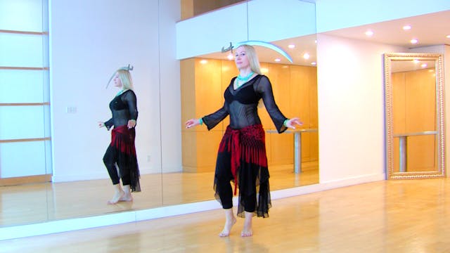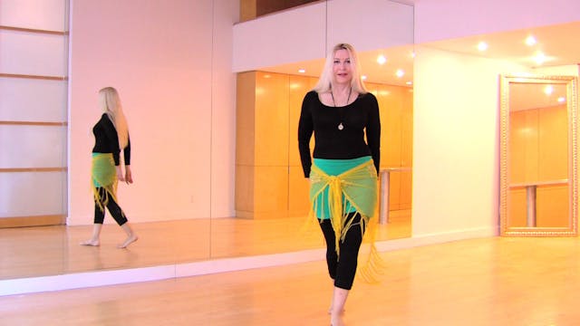 In this practice choreography we explore different ways to travel, switching between directions and diagonals and fine-tuning your position on stage in a showy and dramatic manner. We'll take our travel steps beyond a string of belly dance moves and make them a way of reaching out to your audience.